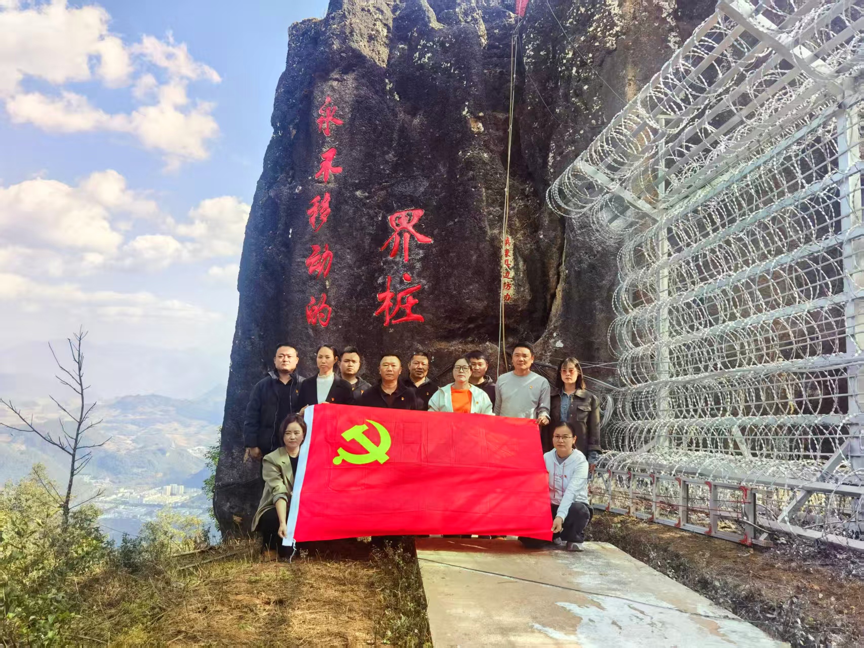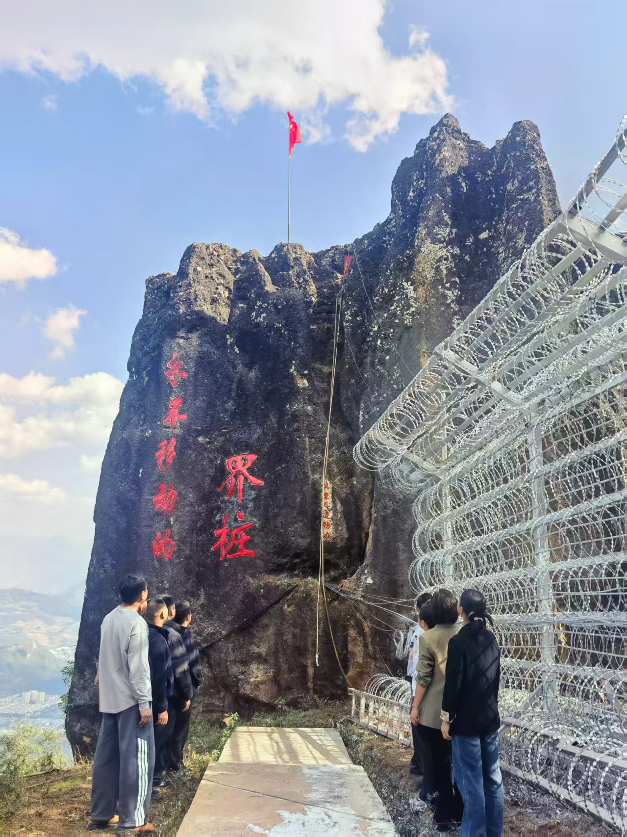 在听着边境管理员小喇叭“你已进入中国边境……”的喊声中,大家激情满满,一个也不甘落后。看到矗立在半山腰“永不移动的界桩”时,刘青峰十分激动,他说:“小时我就听说有一个高石头界桩,但我根本没有想到这么雄壮,这个天然的界桩稳稳地站在这里,就像站岗的士兵们,又像守边的英雄,它在告诉我们中华人民共和国领土不可侵犯,我一定要回去讲给我们的德昂族群众听听”。全体党员在界桩旁整齐列队、合影留念,让鲜红的党徽与庄严的界桩相映成辉,将守土戍边的坚定信念深深镌刻在心中。