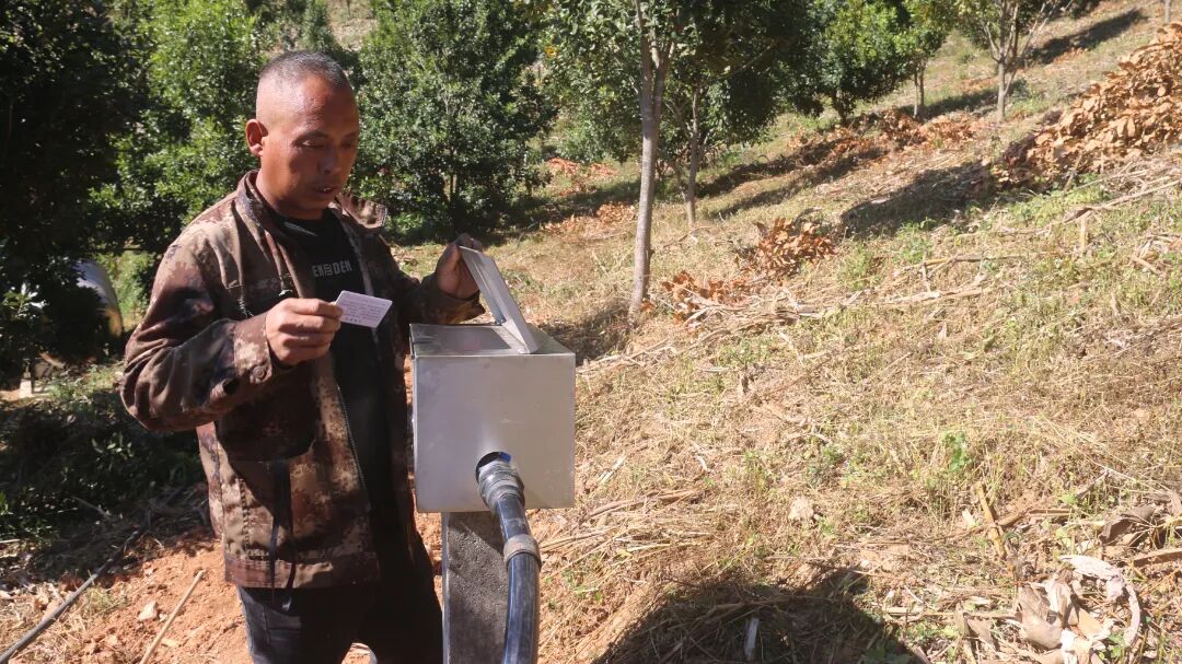 “我们将山顶上蓄水池的管网直接架设到每家每户的产业地里,每隔50米就设置一个智能取水箱,农户只需用智能取水卡扫描箱内二维码,就能实现自动取水,如果农户需要施肥打药,也可通过山顶蓄水池旁的智能水肥一体机按照水肥药配比实现远程作业,按需计量、便捷高效……”施工队负责人丁洪补充道。