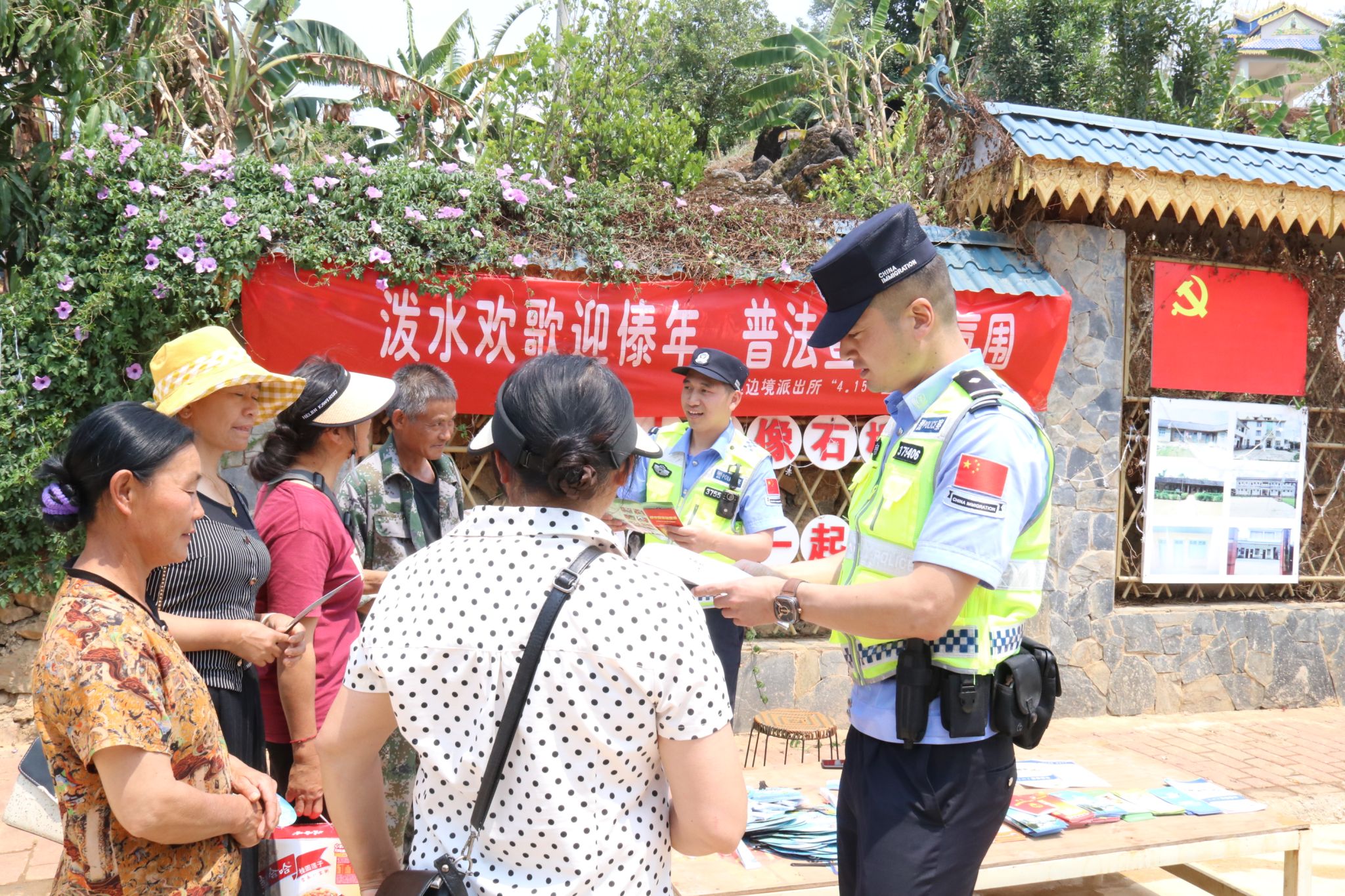 一大清早,帮东村的傣族妇女便开始着手制作傣族特色小吃“糖粑粑”,部分村民身着傣族服饰前往缅寺挑花、贡花,祈祷新的一年平安幸福、风调雨顺,值此契机,勐堆乡派出所、司法所的有关工作人员在人群密集的文化走廊也给各族群众带去了法律法规政策宣讲。下午时分,泼水节开幕仪式后,庄稼汉立即化身打击乐手,捶起象脚鼓、敲起金铓锣,男女老少赶摆,各族人民欢聚泼水广场,伴随着欢快的“傣迪”,尽情舞动着健美的身姿,恣意挥洒手中的“幸福之水”,把祝福传递给每个人。