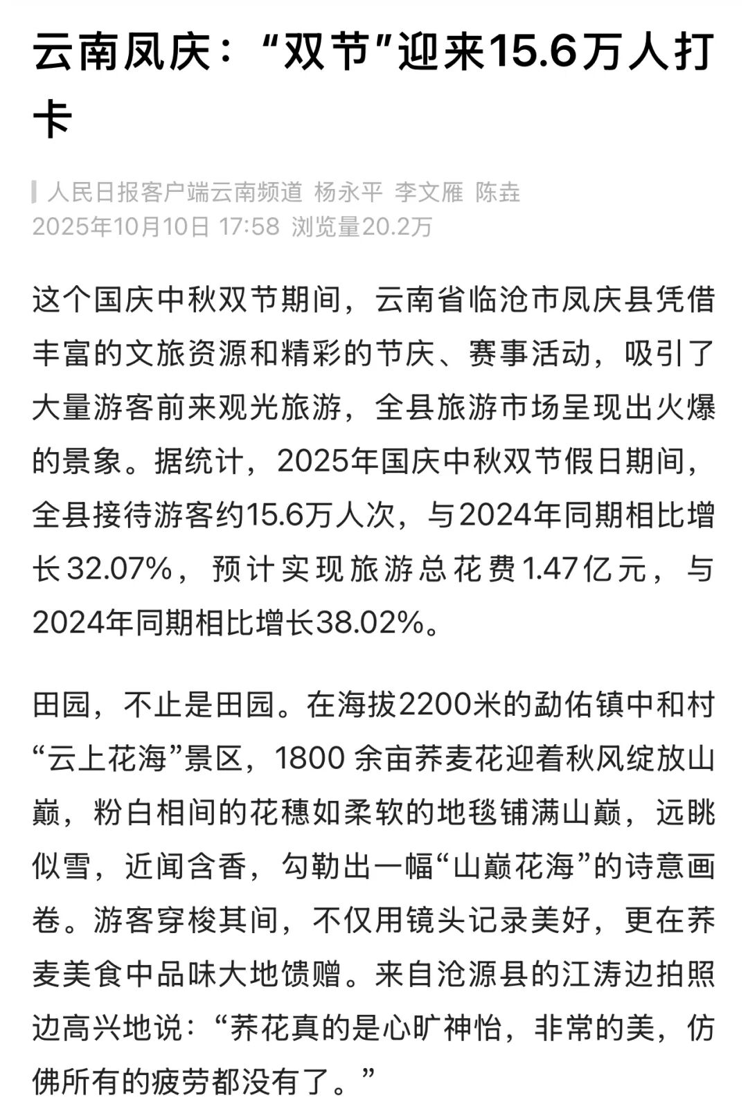 这个国庆中秋双节期间,云南省临沧市凤庆县凭借丰富的文旅资源和精彩的节庆、赛事活动,吸引了大量游客前来观光旅游,全县旅游市场呈现出火爆的景象。据统计,2025年国庆中秋双节假日期间,全县接待游客约15.6万人次,与2024年同期相比增长32.07%,预计实现旅游总花费1.47亿元,与2024年同期相比增长38.02%。