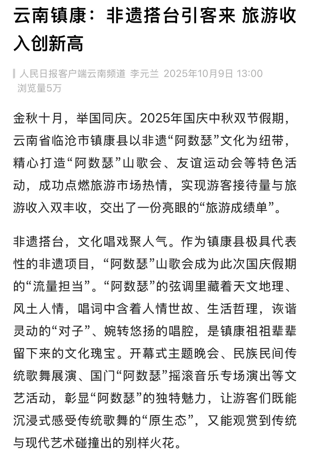 金秋十月,举国同庆。2025年国庆中秋双节假期,云南省临沧市镇康县以非遗“阿数瑟”文化为纽带,精心打造“阿数瑟”山歌会、友谊运动会等特色活动,成功点燃旅游市场热情,实现游客接待量与旅游收入双丰收,交出了一份亮眼的“旅游成绩单”。
