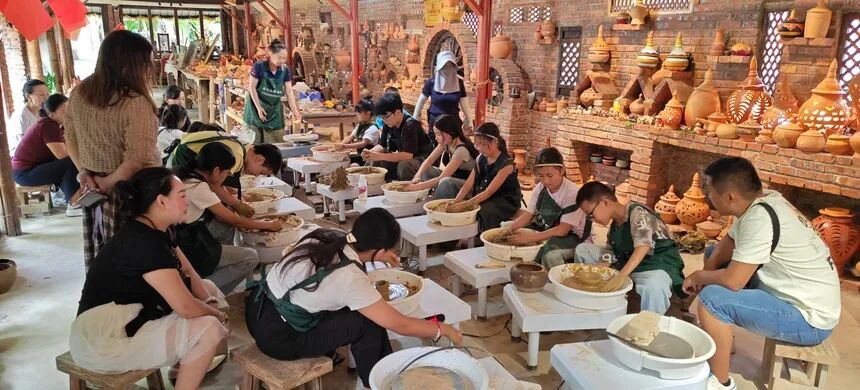 从观赏到参与的深度体验,南汀画院以“艺术+旅居”模式突破传统旅游框架,为游客提供多元化的文化体验。“双节”假期中,南汀画院每日举办3场艺术沙龙,游客可参与油画临摹、傣族剪纸等互动项目;还推出傣族土陶体验,让游客亲手体验土陶传统工艺。据统计,假期参与非遗体验的游客达2000余人次,衍生文创产品销售额突破5万元。此外,特别增设非遗舞蹈,邀请本地民族文艺队与游客共同参与。