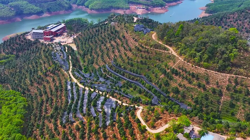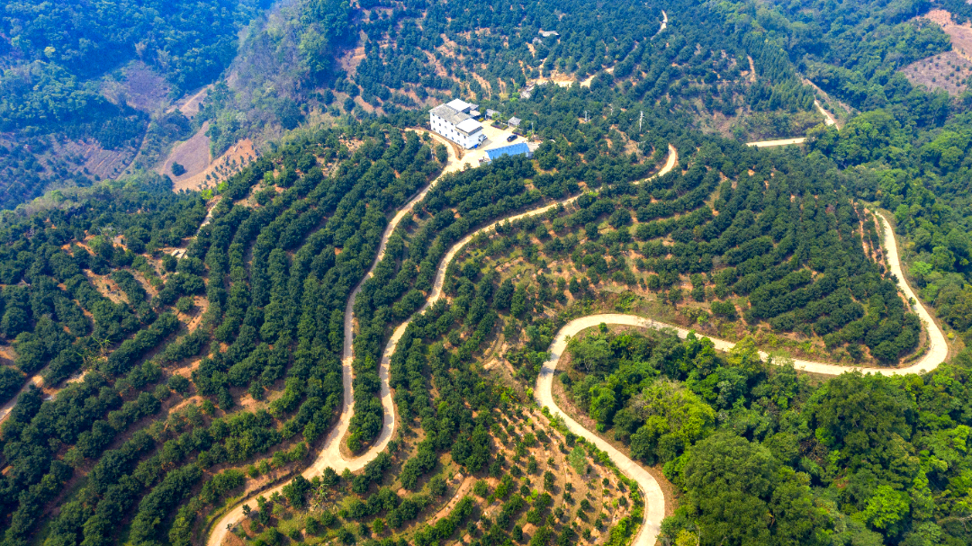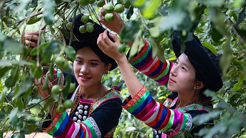 雨后初晴,田坝村的坚果庄园浸润在一片新绿之中。薄雾氤氲间,身着传统苗族服饰的村民三三两两穿行于林间,弯腰施肥、挥锄除草。