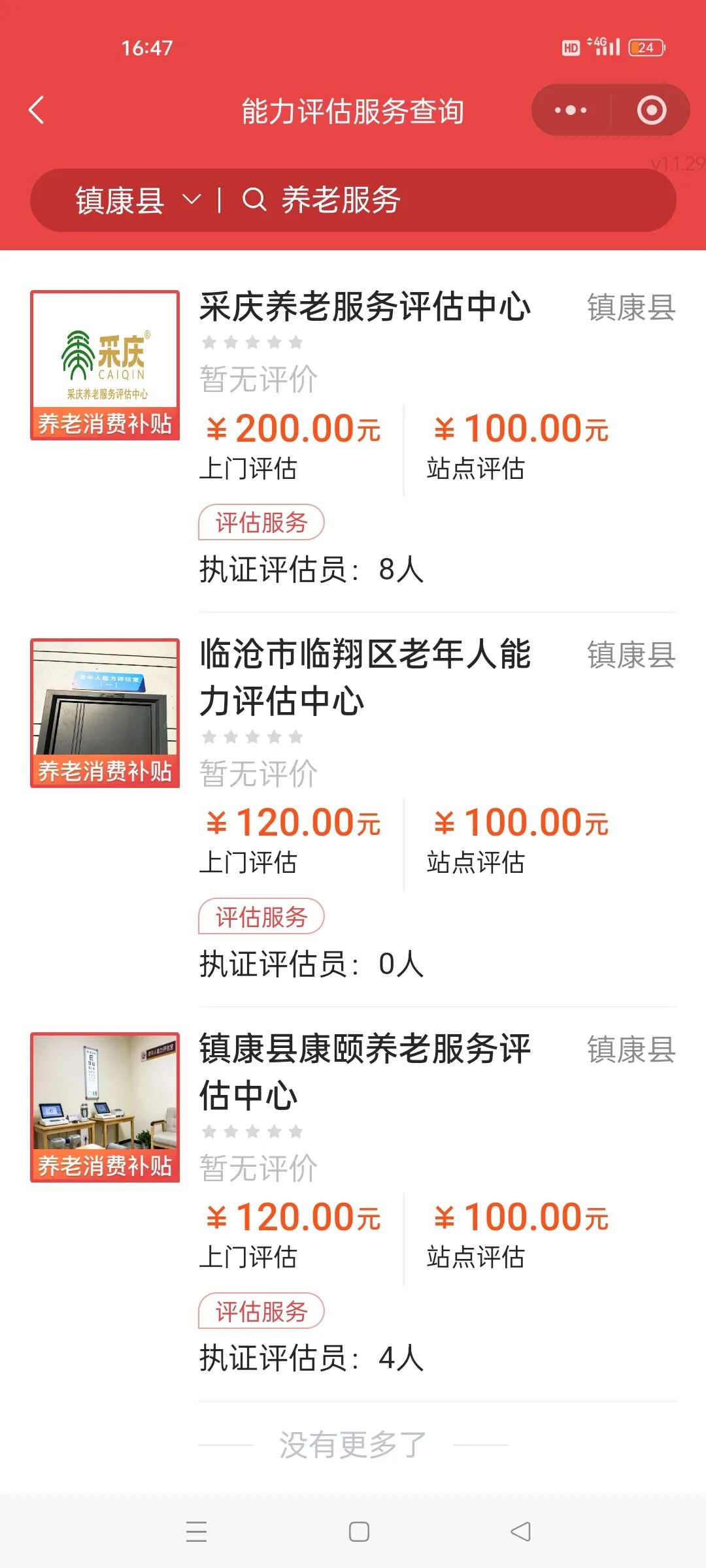 1.在首页点击“养老服务消费补贴项目”,点击进入“个人中心”,点击“切换人员”切换为需要能力评估的老年人,然后再点击进入“服务中心”,点击“能力等级评估申请”,选择“评估机构”,在系统中自行选择一个评估机构,点击“服务申请”,提交评估方式、服务时间。