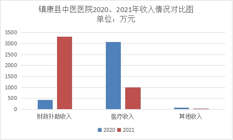 镇康县中医医院2021年度收入合计4,330.21万元。其中:财政拨款收入3,333.15万元,占总收入的76.97%;上级补助收入0万元,占总收入的0%;事业收入996.07万元(含教育收费0万元),占总收入的23%;经营收入0万元,占总收入的0%;附属单位缴款收入0万元,占总收入的0%;其他收入0.99万元,占总收入的0.02%。与上年对比总收入较上年6093.71万元减少28.94%,主要原因为我单位2021年4月被定为新冠肺炎定点救治医院,收入来源主要为财政补助。