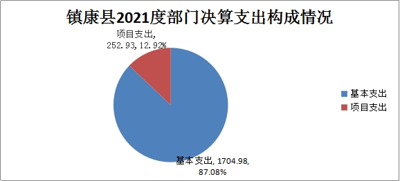 镇康县凤尾中心卫生院2021年度支出合计1957.91万元。其中:基本支出1704.98万元,占总支出的87.08%,比上年同期1318.38万元增加386.6万元,增幅29.32%,主要原因分析:基本支出占比较大的原因是人员支出占比较大及单位医疗业务经费支出。由于本单位主要收入来源为医疗业务收入,所以医疗业务经费也随之占比大;项目支出252.93万元,占总支出的12.92%,比上年同期225.77万元增加27.16万元,增幅12.03%,主要原因分析:2021年受新冠肺炎疫情影响,项目支出大幅度增长;上缴上级支出、经营支出、对附属单位补助支出共0元,占总支出的0%,比上年同期增加0%。